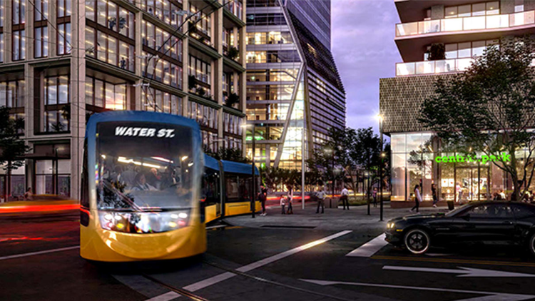 A rendering of what a modern streetcar line might look like in the Water Street District. Credit: City of Tampa.
