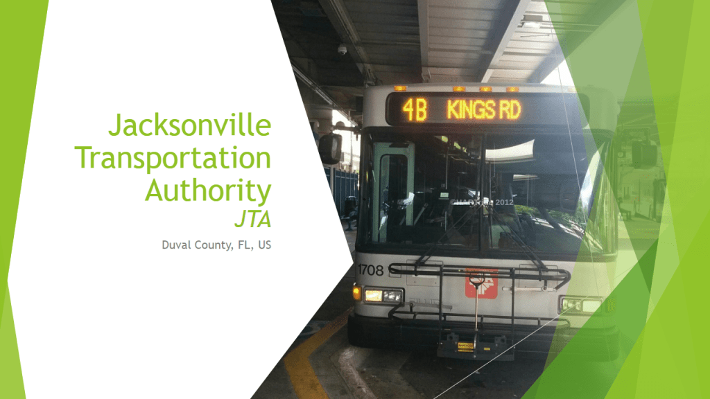 Jacksonville Transportation Authority (JTA) is a multi-prong transportation agency serving Duval County, Florida, including the city of Jacksonville. The agency was established through an act of the Florida Legislature in 1971 & provides fixed-route bus services, an automated people mover/monorail line, auto ferry service, two van services, & paratransit service. The agency also administers the design & construction of city & county maintained roadways & bridges.