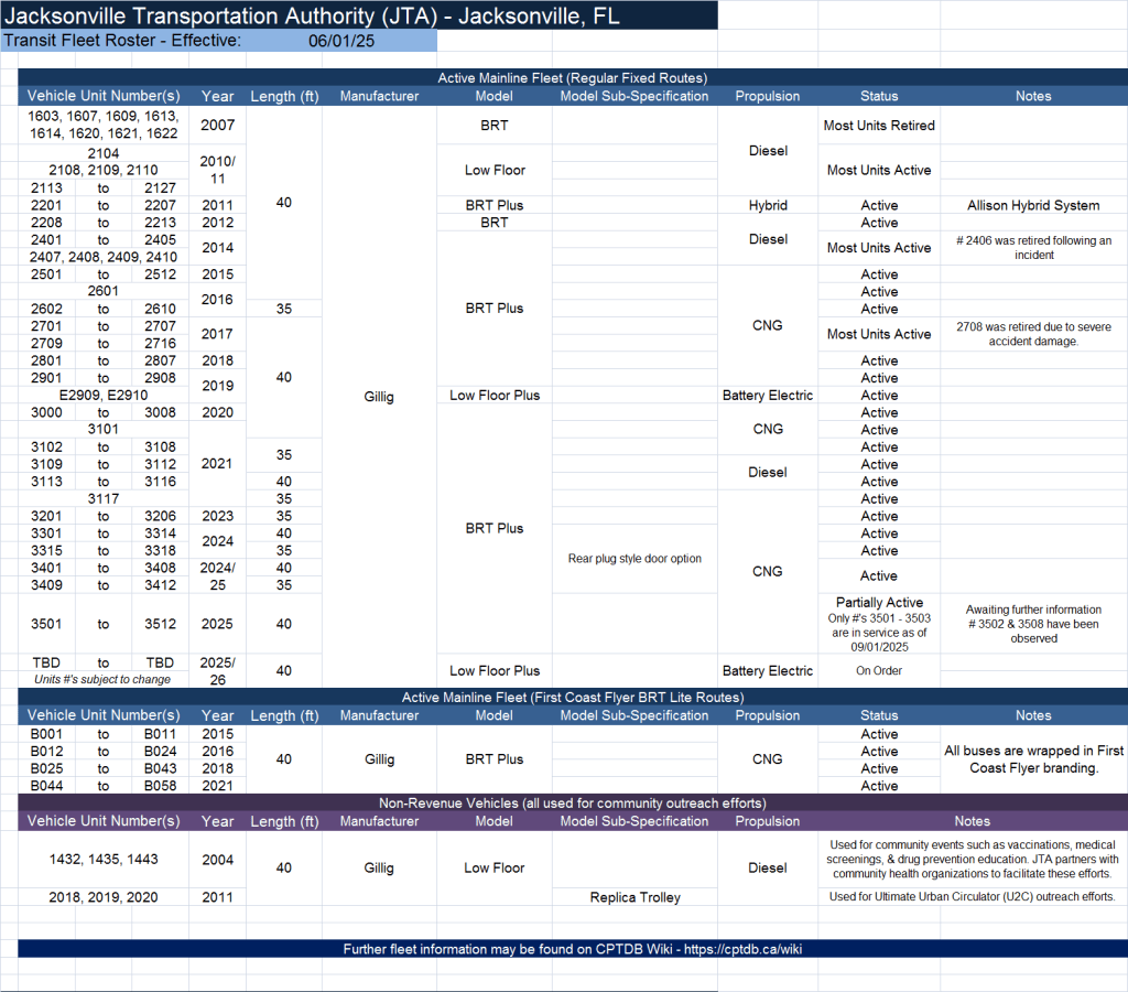 JTA uses a large fleet of Gillig Low Floor buses, with some being of the BRT styling & many others being of the BRT Plus styling. Almost 2/3 of the fleet is fueled by Compressed Natural Gas (CNG). Below are the different variants of Gillig buses that JTA currently operates: