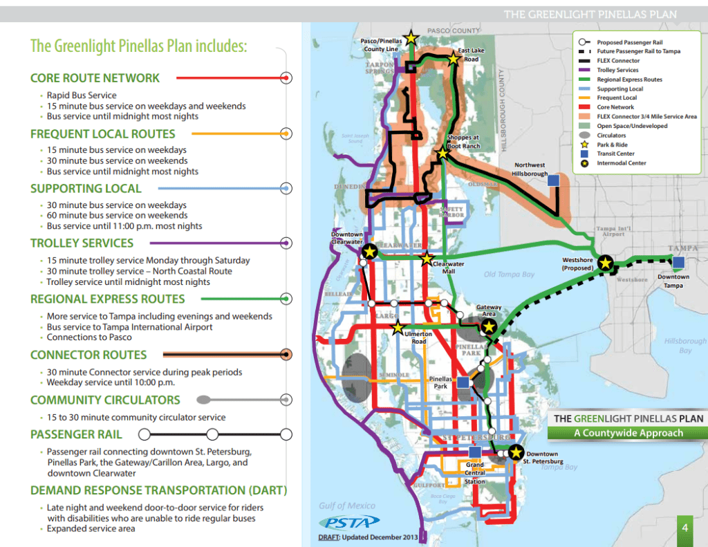 The most recent attempt for a dedicated sales tax was the Greenlight Pinellas plan. Had the voter initiative passed in the fall of 2014, it would have allowed PSTA & Pinellas County to enact transformational improvements & expansion to the entire bus network, as well as utilize CSX freight right-of-way for a north-south light rail line. Several rapid bus routes were proposed under the plan – which would allow for eventual transitioning to a Gold Standard Bus Rapid Transit (BRT) service on select corridors. These corridors include: