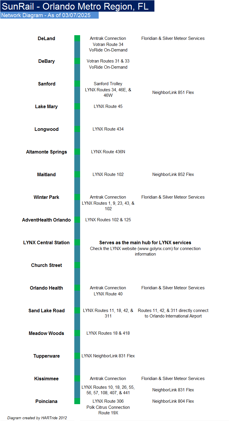 A static diagram of SunRail, its stations, & transit connections, is shown below. However, the SunRail website provides an interactive map showing station locations, parking options, major destinations along the corridor, & train locations as the move up & down the corridor.