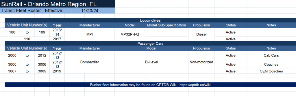 SunRail utilizes 11 MotivePower MP32PH-Q diesel-powered locomotives & 23 Bombardier-built bi-level passenger coaches. A typical consist will comprise of 1 locomotive (facing north) & 2 to 3 passenger cars. During special events, longer consists will be used to handle larger crowds.