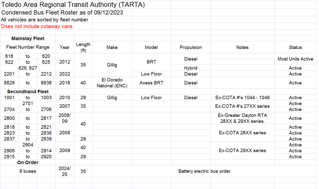 TARTA primarily uses Gillig Low Floor vehicles, though they also have a small fleet of El Dorado National (ENC) Axess BRT style buses. A vast majority of vehicles are secondhand acquisitions from either the Southwest Ohio Regional Transit Authority (SORTA) or the Greater Dayton Regional Transit Authority (GDRTA).